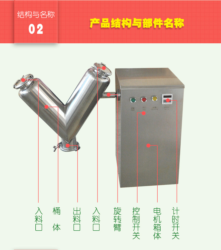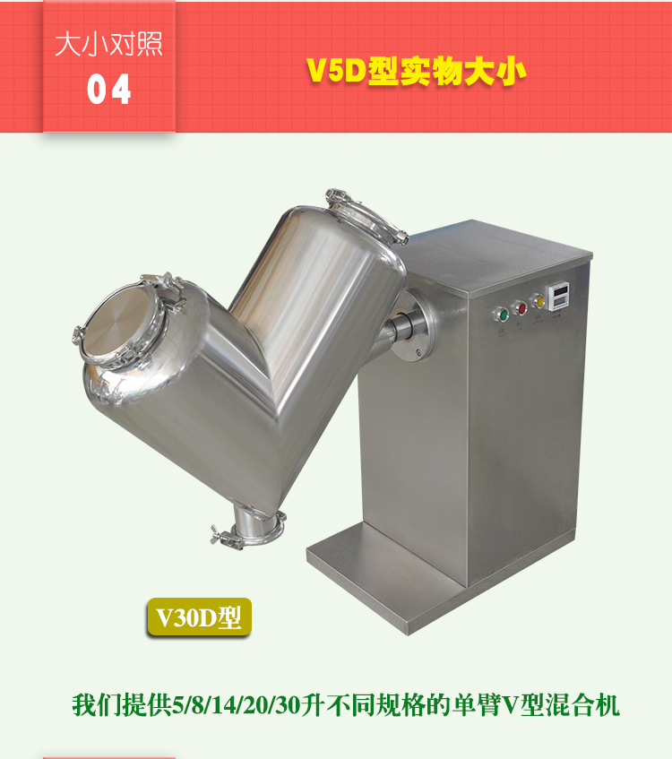 單臂V型混合機利用兩個不對稱的料筒,采用重力混合,物料在料筒內不斷聚中,不斷分散,一般經過5~15分鍾左右時間混合,使兩種或兩種以上充分混合均勻,特別適合對兩種或兩種以上的粉、粒狀物料,比重懸殊較大的混合,混合均勻度達99%以上,混合筒體內外壁經精密拋光處理,表麵光滑、平整、無死角、易清洗,本機與三維混合機、槽型混合機等產品功效齊全。