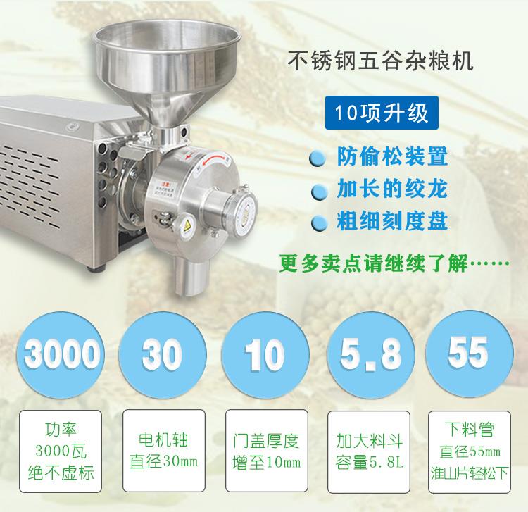 五穀雜糧粉碎機是將各種糧食、中藥材等食物研磨成50~200目的均勻粉末的一種研磨設備。五穀雜糧磨粉機采用優質不鏽鋼製作,是配備全銅線“中國有名品牌電機”,根據客戶需要,可以配220V生活用電,也可以配380V工業用電,價格相同,動力強勁,五穀雜糧磨粉機靠兩塊布滿齒槽的磨盤對磨運轉從而將物料磨成粉末。連續投料式作業,結構精密,噪音較小,操作簡易,粉碎細膩,無粉塵,適用於超市和商場專櫃、五穀雜糧加工店使用。五穀雜糧磨粉機改變了鐵質磨粉機之外表粗糙、噪音大、出粉粗、難清理、電機動力不足等缺點,加工出的食品達到了GMP食品衛生要求。